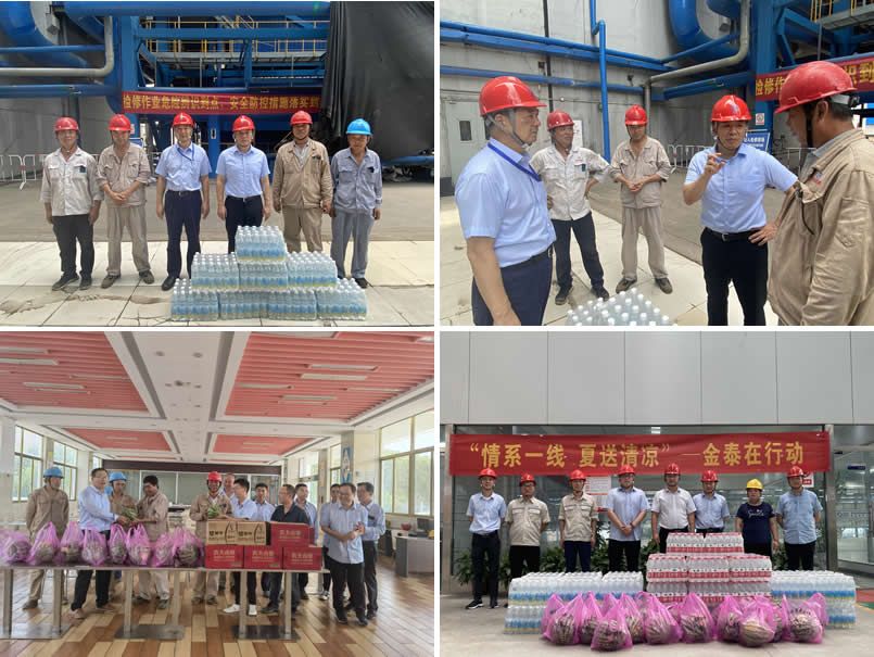 随着酷暑到来,气温持续升高,室外热浪扑面,公司生产现场员工往返于车间、设备的身影不断,汗水浸湿了他们的脸庞、油渍布满了他们的衣衫。但他们始终坚守岗位,抗高温、战酷暑,用责任守护安全、用汗水诠释奉献,全体员工齐心协力为企业争创效益。 在此炎炎夏日,公司高度重视员工防暑降温工作,董事长在高层联席会上专题部署要求,事业部、各部门也积极落实措施。一方面给员工发放夏季防暑降温物品,同时采购盐汽水供大家饮用;另一方面及时调整员工三餐、每天供应绿豆汤解暑,在食堂增设饮料机等;同时还购买水果、冷饮等解暑物品专门慰问一线生产、检修人员。将防暑降温工作落到实处,让员工真正感受到企业的关怀与保障。 6月29日,集团董事长顾鼎,董事长助理、执行总经理、热电事业部总经理徐振华到现场看望和慰问6#炉检修、磁电脱盐项目各外委单位人员。顾董对坚守在现场的检修人员、外委单位表示衷心地感谢,感谢大家对金泰公司工作的支持以及付出的努力,同时实地查看现场作业环境、了解当下存在的困难、协调解决的事项;顾董希望双方携手努力,确保本次检修、技改项目的安全、质量和进度,公司也将全力做好各项支持和保障服务。 7月13日,集团副总经理、建材事业部总经理周叶年,公司副总经理、工会主席周志丹到现场了解建材事业部一线生产及防暑降温情况。周总嘱咐一线员工要注意自身防暑,同时事业部综合办要密切关注员工生活、了解员工心声,在保障正常生产的同时确保员工身体健康。受董事长委派,周主席也传达了董事长对一线员工的关心,周主席表示集团总经办将与事业部综合办共同做好员工防暑降温工作,为员工做好各项后勤保障。 高温酷暑浇灭不了金泰员工积极工作的饱满热情,也阻挡不了企业关怀员工的坚定脚步。公司通过各种方式关心、保障员工身体健康,不管身处什么岗位、不管是炎炎夏日、还是凛冽严冬,金泰公司永远和员工拧成一股绳,诠释并践行着“正道、凝聚、创新、卓越”的企业文化精神。