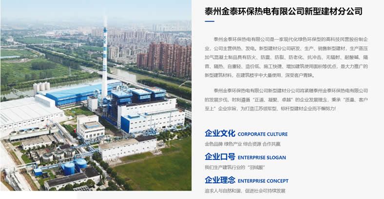 乐鱼网页版位于“水陆要津,咽喉据郡”之称的历史文化名城--江苏泰州,是一家现代化绿色环保、高新技术型民营股份制企业。公司主营供热、发电,致力于发展环保事业,奉献清洁能源。2020年3月成立金泰环保热电有限公司新型建材分公司,分公司是集研发、生产、设计、销售为一体的专业化新型建材企业。