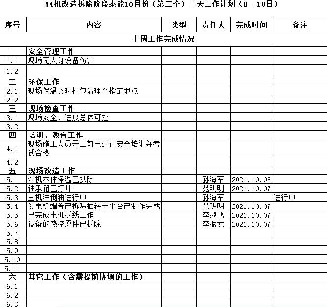 本次改造工程时间紧、施工难度大,伴随着年末汽量的回升,新 4#机早投产一天就能多创造一天经济效益。汽机改造项目部按照11月底投产发电的总体目标统筹安排各专业工作,同时三天制定一个小计划,梳理工作重点,明确各自责任;项目部定期召开三方工程例会汇报施工进度、通报现场考核、沟通协调事宜、制定下阶段计划,将三天小计划落到实处;各专业明确分工,相互配合,通过三天小计划管控好工程建设安全、质量和进度,通过每一个三天小计划串联起工程建设大目标,于寻常处见功力,于细微处见真章,从点点滴滴做起,力争高质量完成本次改造工程。